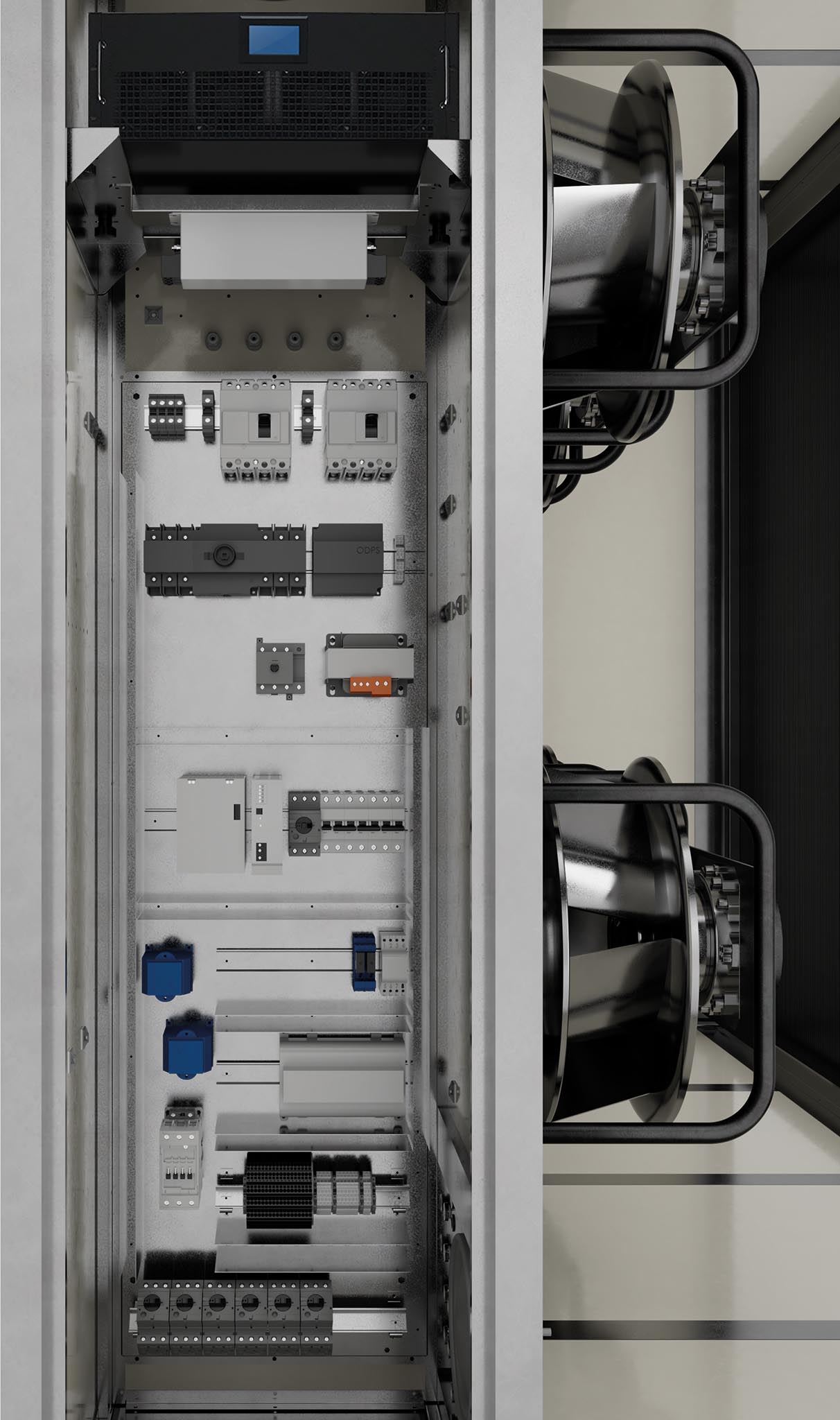 Les filtres à air, le panneau de commande, l'onduleur, le réseau de ventilateurs, la batterie de refroidissement (jusqu'à 8 rangées) et les registres sont intégrés en fonction de vos besoins dans une enceinte en profilé d’aluminium anodisé posée sur un châssis en acier galvanisé à chaud. L’ensemble du module est pré‑testé et prêt à l’emploi.