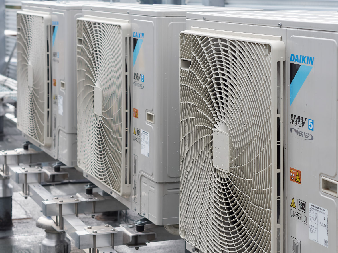 VRV-warmtepompen leveren verwarming en koeling om op elk moment een comfortabele werkomgeving te garanderen.