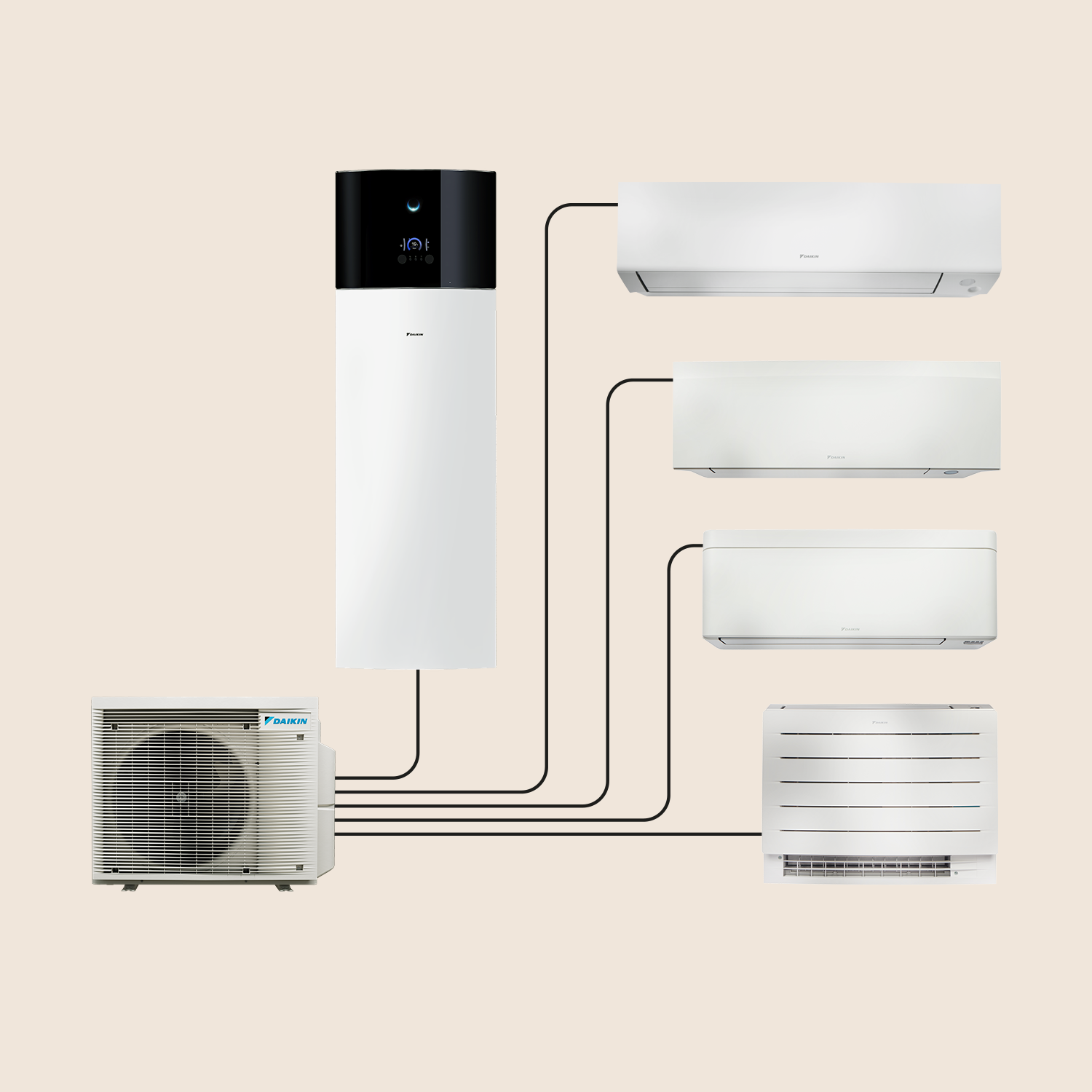 Verwarmen en koelen van je woning en productie van sanitair warm water door één enkele buitenunit aan te sluiten op maximaal vier binnenunits en een tank voor sanitair warm water