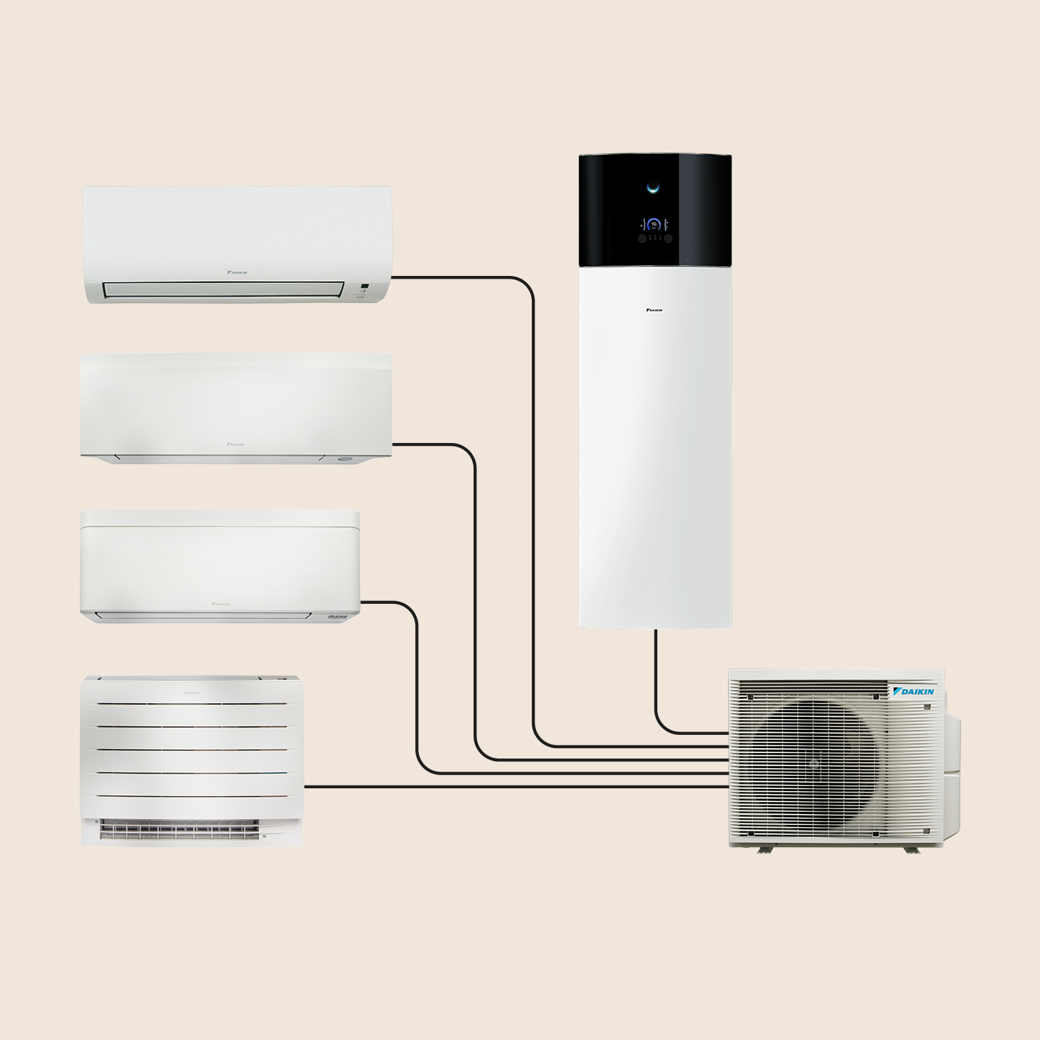 Verwarmen en koelen van je woning en productie van sanitair warm water door één enkele buitenunit aan te sluiten op maximaal vier binnenunits en een tank voor sanitair warm water
